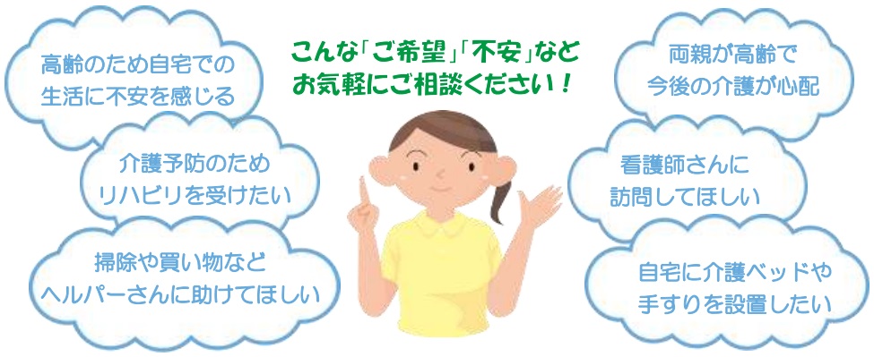 住み慣れた地域で安心してお暮しいただけるようサポートさせていただきますので、介護保険に関することや、介護に関する不安やお困りごとなど何でもお気軽にご相談ください。