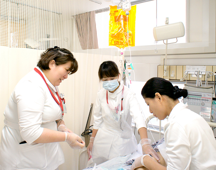 迅速で確実な救命技術の実施や、危機的状況にある患者さん・ご家族への対応など、専門とする救急看護領域全般において、根拠に基づいた看護を実践しています。それと同時に、法人内の同じ看護師への指導や相談に応じるなど、組織横断的にも対応します。(写真中央 青のユニフォーム)