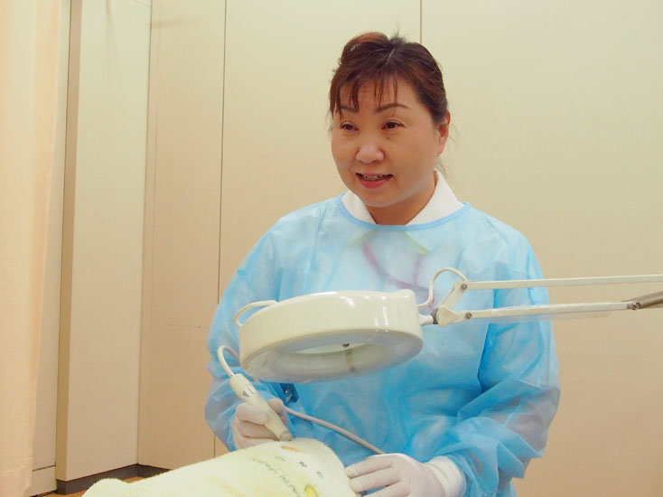 また、足壊疽(えそ)などのトラブルに対してリスクの高い患者さんに、必要なケア(写真)と指導を行っています。なかでも、糖尿病は足の神経障害や血流障害から足の潰瘍や壊疽(糖尿病足病変)にかかり、重症になることがあります。未然に防ぐため、糖尿病患者様への指導、血管病変に関する検査、相談に応じたりもしています。