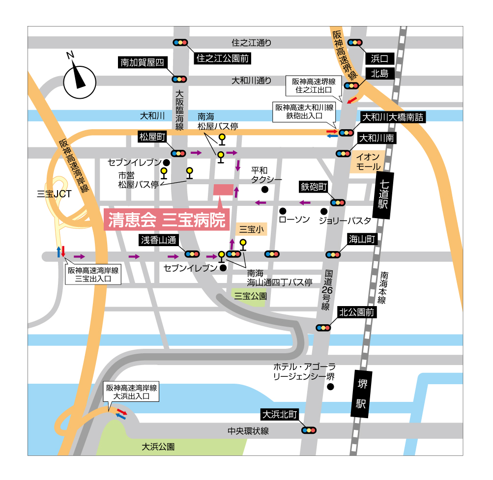 - 南海線「七道駅」― 清恵会三宝病院 - 南海線「堺駅」― 清恵会病院