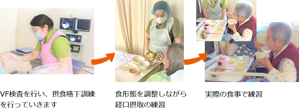 口や喉に食物が溜まっていないか、誤嚥の有無、食事の形態や食事時の姿勢を評価して、口から食べることの練習方法や方針を決定します。
