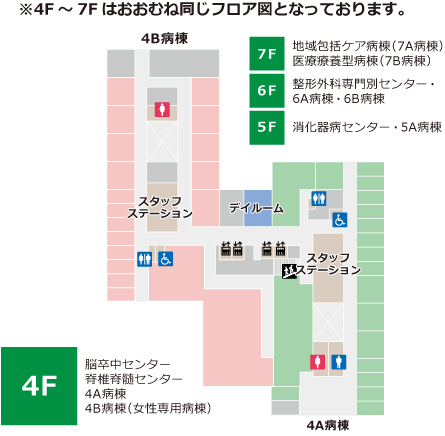 | 4F | 脳卒中センター・脊椎脊髄センター 4A病棟・4B病棟(女性専用病棟) |