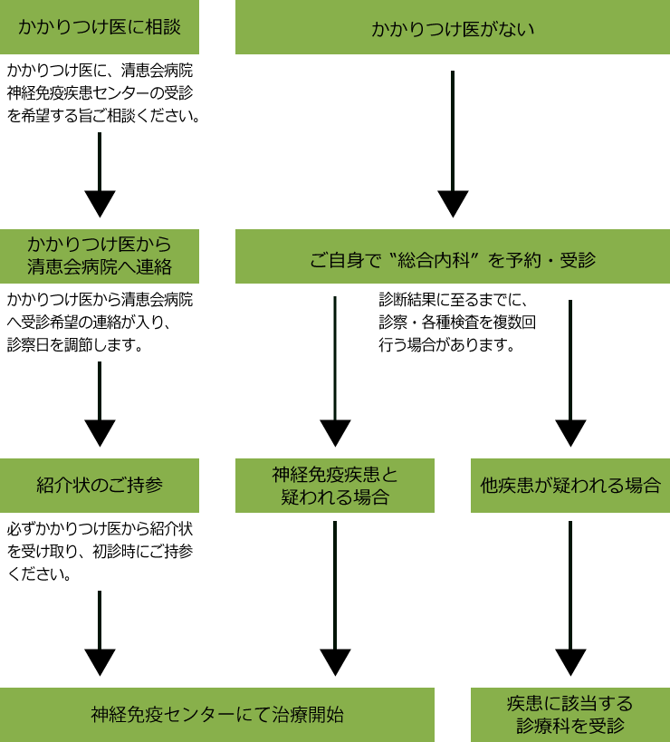 神経免疫疾患センターを受診される場合、かかりつけ医の有無でご予約方法が異なります。